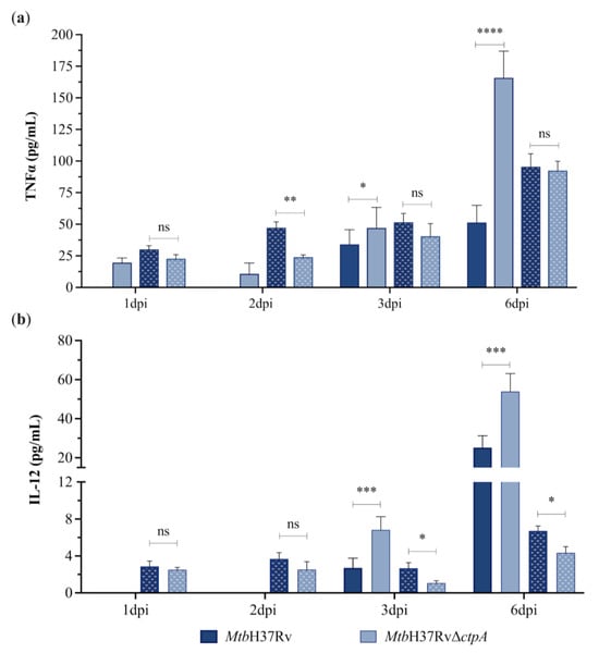 Gene expression analysis in MH-S cells shows that cells infected with the MtbΔctpA strain in the absence of CuSO4 exhibited a higher level of IL-1β transcription than cells infected with the wild-type strain at 6 dpi, which is not observed in the presence of the metal (Figure 4). Similarly, the MtbΔctpA strain induced statistically significantly higher levels of TNF-α and IL-12 than the control strain at 3 to 6 dpi, only in the absence of the metal (Figure 5). These findings suggest that, in the absence of copper ctpA, deletion affects the immunogenicity of Mtb in vitro; however, the infection of MH-S cells with MtbΔctpA induces the production of key protective cytokines that contribute to the control of bacilli growth by macrophages [49,50,51,52].