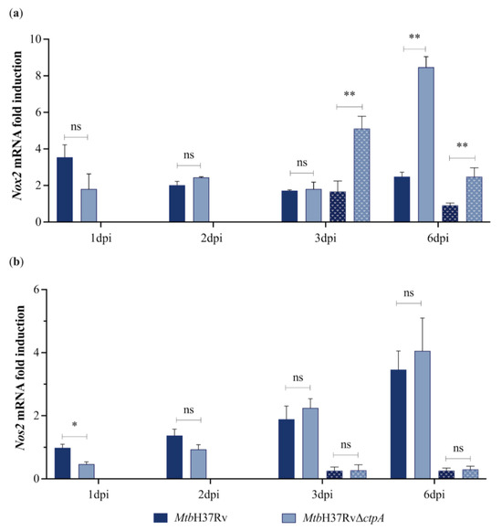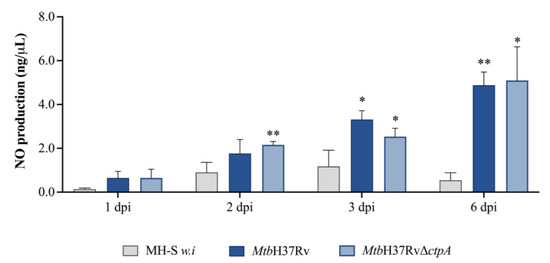In a previous report, we discussed the potential relevance of CtpA-mediated copper transport in the ability of the bacillus to cope with redox stress under in vitro conditions [16]. To evaluate whether the deletion of ctpA affects the redox stress exerted by macrophages under infection, the production of ROS (O2•−) and RNS (NO) was compared in MH-S cells infected with MtbH37Rv or MtbΔctpA. Additionally, the expression of the genes encoding key enzymes in the production of NO (iNOS, the Nos2 gene) and O2•− (NADPH oxidase, the Nox2 gene) was determined [54,55,56,57]. Activation of the Nox2 gene was higher (3.41-fold) at day 6 in MH-S cells infected with the mutant strain MtbΔctpA compared to cells infected with the wild strain MtbH37Rv (Figure 6a). Moreover, stimulation of macrophages with 50 μM CuSO4 resulted in activation of the Nox2 gene with the MtbΔctpA mutant strain from 3 dpi (Figure 6a). Conversely, transcription of the Nos2 (iNOS) mRNA and NO production exhibited a time-dependent induction in Mtb-infected macrophages (Figure 6b and Figure 7). However, there were no significant differences in NO production between cells infected with the wild-type or the mutant strain.