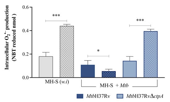 Intracellular ROS production from Mtb-infected MH-S cells. Intracellular superoxide anion production by MH-S macrophages infected with MtbH37Rv or MtbH37RvΔctpA (MOI 1:3), in the absence (solid bar) or presence of the inducer PMA (900 ng/μL) (dotted bar), was measured using the modified colorimetric NBT assay [41,42]. Stimulation with PMA in uninfected (w.i) macrophages is the positive control of ROS production. As a negative control, the cells were incubated with 45 μg/mL SOD, but the levels obtained were below the detection limit. Asterisks indicate the two-tailed (unpaired) t-test comparison nmol NBT without PMA stimulation (* p < 0.05; *** p < 0.001).