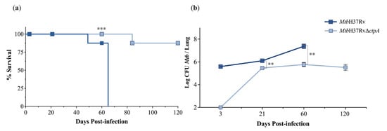 Survival and lung bacillary burdens in BALB/c mice infected with either ctpA mutant or parental MtbH37Rv strains. (a) Almost all mice infected with mutant ctpA strain survived, while all animals died after 60 days of infection with the parental strain. (b) Groups of four animals were euthanized at the indicated days and lungs were used for the determination of live bacillary burdens by the quantification of CFU. At 3 dpi, the number of CFU in animals infected with the mutant strain was so low that it was below the limit of detection (2 Log/CFU). Asterisks indicate the significant difference by two-tailed unpaired t test (** p < 0.01; *** p < 0.001).