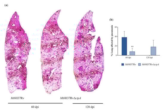 To evaluate the level of virulence in vivo of the ctpA deletion in Mtb, the survival, bacterial loads, and extension of tissue damage (percentage of lung area affected by pneumonia) were determined in BALB/c mice infected intratracheally with 2.40 × 105 CFU of MtbH37Rv or 2.07 × 10⁵ CFU MtbH37RvΔctpA [43,48,59]. Almost all of the animals infected with the ΔctpA strain survived during the whole experimental period (four months), with only one animal dying at 84 dpi. In contrast, mice infected with the parental strain started to die at 49 dpi and all the animals died at 65 dpi (Figure 9a). These results correlated well with those determined by CFUs of lung homogenates. The bacilli inoculum was similar for both strains; however, at 3 dpi, the number of CFU in the lungs of mice infected with the mutant MtbH37RvΔctpA was so low that it was below the detection limit (100 CFU/lung). In contrast, in the lungs of animals infected with the parental strain, approximately 3.93 × 105 CFU/lung was observed (Figure 9b). Furthermore, with respect to the bacilli inoculum, at 21 dpi, the bacterial load in the lungs of mice infected with the wild-type and mutant strain exhibited an increase of approximately 5.46-fold (1.31 × 106 vs. 2.40 × 105 CFU) and 1.44-fold (2.98 × 105 vs. 2.07 × 105 CFU), respectively. At 60 dpi, the bacterial load exhibited an additional increase of ~20-fold (2.59 × 107 CFU) and ~2.57-fold (7.65 × 105 CFU) in the tissues of animals infected with the wild-type and mutant strains, respectively (Figure 9b). By day 120, animals infected with the MtbΔctpA mutant strain exhibited a similar bacterial load (4.79 × 105), while no survival animals infected with the parental strain were available at this time point (Figure 9a).