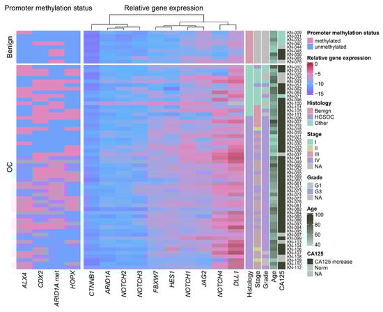 A heatmap of promoter methylation and relative gene expression in gynecologic tumors. ARID1A met—ARID1A promoter methylation, OC—ovarian cancer, HGSOC—high-grade serous ovarian cancer, other—other malignant gynecologic tumors, G1—grade 1, G3—grade 3, CA125 increase—CA125 serum concentration > 35 U/mL, NA—data not available.