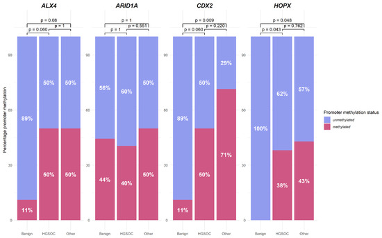 When compared to benign cases, the significant increase in promoter methylation in HGSOC was detected only for the HOPX promoter (p = 0.04); however, a tendential increase (p = 0.06) was also noticed in ALX4 and CDX2 gene promoters. When comparing the other OC cases (non-HGSOC OC) to benign counterparts, CDX2 and HOPX showed increased promoter methylation (p = 0.01 and 0.05, respectively) (Figure 2). Additionally, in the HGSOC group, a significant increase in ARID1A gene promoter methylation was found in advanced FIGO stage cases (p = 0.05) (Supplementary Figure S2). No further associationsbetween gene promoter methylation status and clinical features of serum CA125 concentration, FIGO stage, grade or age were found (Figure 1).