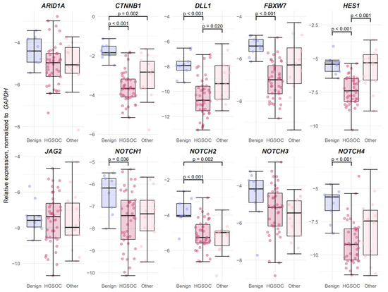 Comparing HGSOC samples with benign samples, a significant reduction in all but JAG2, NOTCH3 and ARID1A gene expression was noted, with CTNNB1 expression decreasing by two-fold (FC = 2.01; p < 0.001), which was the most out of all genes included in the panel. Notably, reduced DLL1 and HES1 expression was also detected in HGSOC when compared to other (non-type II) gynecologic tumors (FC = 1.17 and 1.43, respectively; p < 0.02). Notch receptor NOTCH2 and Wnt gene CTNNB1 expression were also significantly reduced in other gynecologic tumors when compared to benign tissues (FC = 1.32, and 1.62, respectively; p = 0.002) (Figure 3).