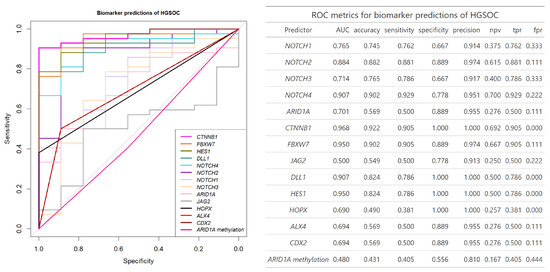 A few other publications have previously hypothesized that Notch pathway genes correlate with ovarian cancer recurrence and can discriminate between high- and low-risk OC. A 10 Notch gene combination, which included HES1 and JAG2, has been able to classify TCGA and two other OC datasets into high- and low-risk groups independently from other clinical variables [43]. Another 11 Notch genes successfully differentiated OC from normal tissues and its signature predicted a 10-year prognosis with an AUC of 0.79 [44]. On the other hand, gene promoter methylation combination models have also been suggested for discrimination of HGSOC vs. benign tissues, with HOXA9 (another HOX family gene), EN1 and CA125 pre-operative levels reaching a sensitivity of 98.8% and specificity of 91.7%, while single HOXA9 had a comparatively lower sensitivity of 95% [45].