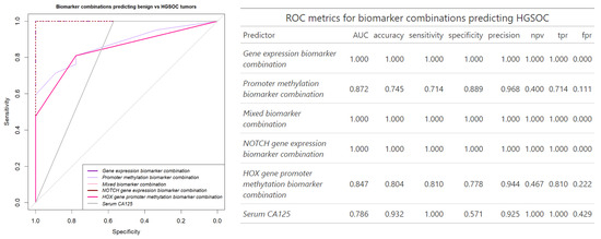 Receiver operator characteristic (ROC) plot and its metrics for the gene expression, promoter methylation biomarker, and serum CA125 biomarker separation of the HGSOC (n = 42) and benign cases (n = 9). Gene expression biomarker combination (all 10 genes), Mixed biomarker combination (all 14 biomarkers), and Notch gene expression biomarker combination (NOTCH1-4, HES1, DLL1, JAG2) curves overlap. HOX gene promoter methylation biomarker combination includes three genes (HOPX, ALX4, CDX2), serum CA125 threshold concentration considered 35 U/mL.