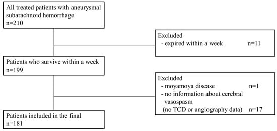 A total of 210 patients were treated in our institution due to aneurysmal subarachnoid hemorrhage from 2016 to 2020. Among them, 11 patients were expired within a week due to initial poor clinical condition. Since one patient had moyamoya disease, we could not confirm whether the vasospasm was present during the hospital course. There were 17 patients for whom we could not estimate vascular condition due to a poor temporal window, which led to failure measuring initial or following values measured by TCD ultrasonography or the absence of subsequent radiologic evaluations. Finally, 181 patients enrolled in this study (Figure 1).