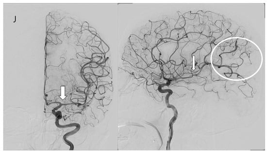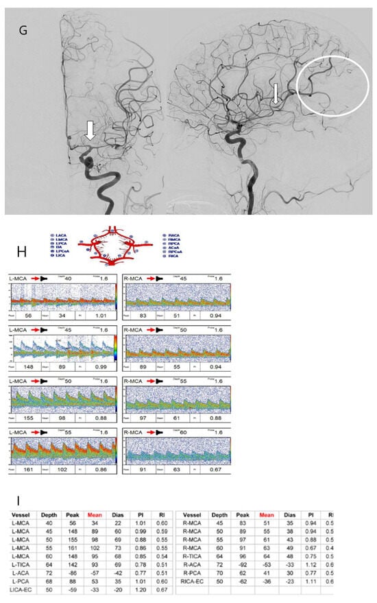 A fifty-year-old female patient with a severe headache visited our emergency room. She had hypertension and had been taking a calcium channel blocker. Initial brain CT and CT angiography revealed an aneurysmal subarachnoid hemorrhage (Hunt–Hess grade 2 and modified Fisher grade 3) due to a ruptured left MCA bifurcation aneurysm (Figure 3A). An emergent TFCA was performed, revealing the aneurysm to have a maximal size of 6.21 mm and a neck size of 3.21 mm. Emergent coil embolization using the double microcatheter technique was successfully performed. The ruptured aneurysm occluded completely without procedural complications (Figure 3B). We inserted a lumbar drain to treat mild hydrocephalus, and the patient was admitted to the ICU for intracranial pressure control and vasospasm prevention. Initial TCD ultrasonography was conducted the day after coil embolization (Figure 3C,D). TCD ultrasonography monitoring continued for 2 weeks to detect vasospasm. The blood flow velocity of the left MCA was increased slowly. However, the patient experienced no clinical symptoms except for a headache. Seven days after coil embolization, she complained of severe headache and left-side visual disturbance. Immediate follow-up TCD ultrasonography revealed severe vasospasm, the mean blood flow velocity having doubled (Figure 3E,F). TFCA was conducted to confirm and treat the vasospasm. TFCA revealed severe vasospasm in the cerebral vessels of the left hemisphere (Figure 3G: the white arrow and circle denote regions of decreased blood flow attributable to vasospasm). Intra-arterial nimodipine angioplasty was performed for 4 days, after which the vasospasm and her symptoms gradually improved (Figure 3H–J: the white arrow and circle highlight areas of restored blood flow following intra-arterial nimodipine angioplasty). She was discharged at 3 weeks after coil embolization without neurologic symptoms. Her mRS score at 6 months post-embolization was 0.