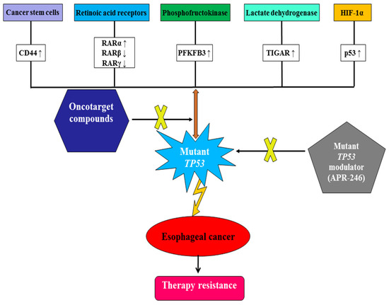 The prevalence and deaths from esophageal cancer (EC) have recently increased. Although therapeutic strategies depend on the EC stage and recurrence, such as surgical intervention, chemotherapy, radiation therapy, chemoradiation therapy, targeted therapy, and immunotherapy, a more effective and novel treatment for EC is still required. This review briefly describes and summarizes some insightful oncotargets involved in the metabolic modulation of EC, including (1) cancer stem cells (CSCs) for EC progression, poor prognosis, tumor recurrence, and therapy resistance; (2) retinoic acid receptors (RARs) for esophageal carcinogenesis and regeneration; (3) phosphofructokinase (PFK) for EC-reprogrammed glycolysis; (4) lactate dehydrogenase (LDH) as an EC peripheral blood biomarker; and (5) hypoxia-inducible factor-1 alpha (HIF-1α) for the tumor microenvironment under hypoxic conditions. Moreover, the aforementioned oncotargets can be modulated by mutant TP53 and have their own features in the carcinogenesis, differentiation, proliferation, and metastasis of EC. Thus, the clarification of pharmacological mechanisms regarding the interaction between mutant TP53 and the abovementioned oncotargets could provide precise and perspective opinions for minimizing prediction errors, reducing therapy resistance, and developing novel drugs against EC.