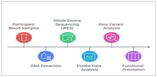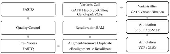 WES: DNA extraction: About 2–4 mL of venous blood samples were collected once during the study period for DNA isolation and extractions using the standard DNA extraction procedures of the lab. Quality control of DNA: The quantity of DNA was measured by the picogreen method using Victor 3 fluorometry, and again by fluorescence-based quantification for WES library preparation. Assessing the nature of the DNA: The assessment was carried out by the agarose gel electrophoresis method. DNA fragments <1 kb: A 2100 Bioanalyzer was used to check the size, and the Femto-Pulse method was used to fragment the high-molecular DNA. The Exome Capture Library from Agilent (version 7) was used to capture the targeted exome fragments, amplified by PCR. After the purification of captured fragments, extensive QC checks were carried out. Once the samples passed the QC check, the samples were loaded into the NGS machine for sequence generation for downstream analysis, as illustrated in Figure 2.