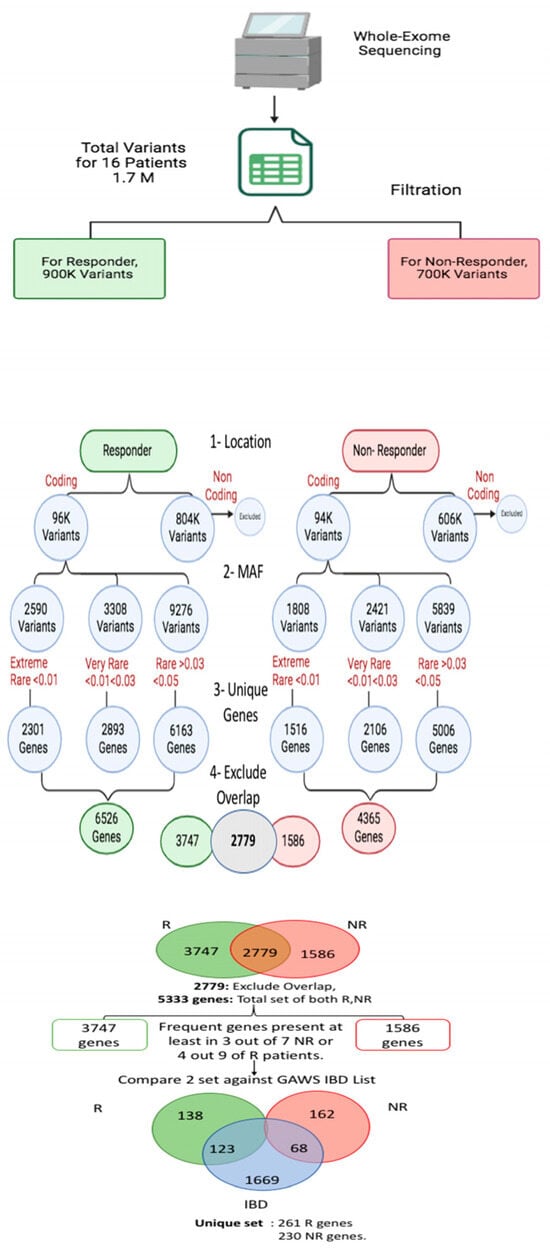 WES data workflow of variants to prioritized genes from responders and non-responders to VDZ in Saudi Arabian patients.