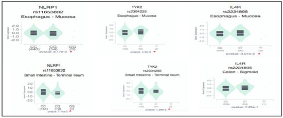 To further validate the biological pathways of the listed genes in the responder group, the GTEx database was explored regarding different tissues for changes in the expression of samples with variants and normal alleles. The GTEx analysis revealed a significant change in the expression of the rare variant of the IL-4R gene (rs2234895) in the esophagus; p = 3.07−2. Additionally, the TYK2 gene variant (rs2304255) showed significant expression in both the esophagus and small intestine (p = 4.5−4 and 1.29−2, respectively) when compared to the normal allele carriers. Furthermore, the NLRP1 gene variant (rs12150220) demonstrated highly significant expression changes (p = 6.17−3) in the esophagus (Figure 8).