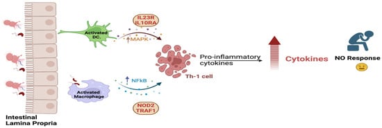 - The five non-responder (NR) candidate genes (NOD2, TRAF1, IL10RA, IL-23R, and IL27) enhance the activation of pro-inflammatory cytokines through MAPK and NFkB pathways, modulate innate and acquired immunity, and activate Th-17 cells, leading to the production of pro-inflammatory cytokines. These functions might contribute to the poor response to VDZ in IBD patients through the following pathways: (a) NOD-NFkB signaling, (b) ulcerative colitis signaling, and (c) the PID-NFkB canonical pathway. Those genes were also found to be associated with the development of the other common autoimmune disease, rheumatoid arthritis. Table 7 highlights the main biological functions of NR genes possibly contributing to poor or non-responder status to VDZ. The activation of pro-inflammatory cytokines through NFκB pathways by NOD2 and TRAF and modulation of immunity by IL10RA and IL27 genes was found.