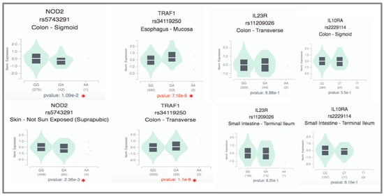 To further validate the biological pathways of the candidate genes in the non-responder group, GTEx profiles in a variety of tissues were searched for in the gene variants. We observed a significant change in the expression of the TRAF1 gene with the rare variant (rs34119250) in the esophagus and sigmoid colon (p = 7.16−9 and 2.88−5, respectively). Additionally, with the NOD2 gene variant (rs5743291), a significant change in expression was observed in the sigmoid colon (p = 1.09−2) and skin p = 2.36−3) (see Figure 10). IL23R and IL10RA did not show any significant changes in their expression between rare and common variant carriers in any tissues analyzed.