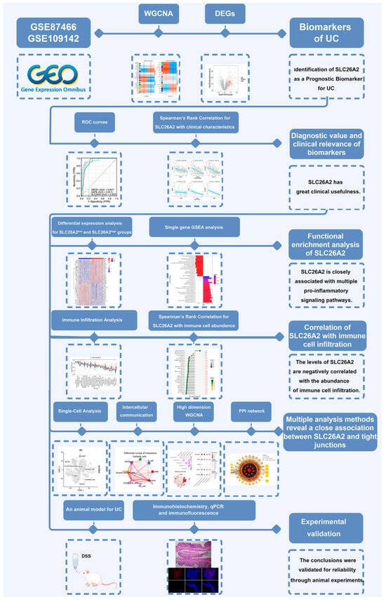 Background/Objectives: The solute carrier family 26, member 2 (SLC26A2) gene, which belongs to the family of SLC26 transporters, can be detected in multiple tissues. However, the studies of SLC26A2 in colon-related diseases are still limited and incompletely understood, especially in ulcerative colitis (UC). Methods: In this study, we attempted to search and identify putative UC candidate genes within a large number of known genes by multiple bioinformatics analyses. The potential cellular characteristics and biological functions of SLC26A2 in the pathogenesis of UC were also elucidated. Results: Notably, SLC26A2 was representative and down-regulated in the intestinal mucosa of patients with active UC, compared to healthy controls. Decreased levels of SLC26A2 were proved to have a more value in diagnosis of UC patients, and closely correlated with some UC characteristics, including the Mayo score and Paediatric Ulcerative Colitis Activity Index (PUCAI). Mechanistically, subsequent results from published datasets and our validated clinical data all strongly implied that SLC26A2 was negatively correlated with the IL-17 signaling pathway, and positively associated with the tight junction, which led to abnormal immune cell infiltration and inflammatory injuries. After establishing the UC mice models in vivo by orally administration of DSS in portable water, SLC26A2 was significantly down-regulated at the mRNA or protein level, when compared to that in the control groups. Furthermore, the correlation analyses confirmed that SLC26A2 was positively associated with CLDN3, and negatively correlated with IL-17A expression in colon tissues. In addition, according to the SLC26A2 expression, UC patients were divided into different subgroups. The potential target drugs for UC treatment, such as progesterone, tetradioxin, and dexamethasone, were initially predicted and exerted anti-inflammatory effects via the common molecule-SLC26A2. Conclusions: SLC26A2 might be served as a protective candidate in the UC pathogenesis as well as a potential drug target for UC treatment.