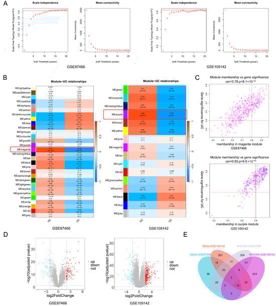 Screening of potential UC-related molecules. (A) Selection of the soft threshold for WGCNA (GSE87466 and GSE109142). (B) The heatmaps indicated the correlations between modules and UC. Red boxes indicate that magenta module in GSE87466 and purple module in GSE109142 exhibited the strongest correlations with UC. (C) The scatterplots showed the relationships between gene significance and module membership in the magenta module of GSE87466 and purple module of GSE109142. (D) The volcano plots displayed all the DEGs. (E) The Venn diagram illustrates the overlapping genes.