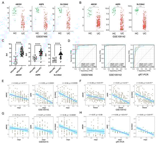 Validate the clinical significance of potential UC related molecules. (A,B) The boxplots illustrated the expressing levels of 3 UC-related molecules between healthy controls and UC samples in the GSE87466 (A) and GSE109142 (B) datasets, respectively. (C) The ABCB1, AQP8, and SLC26A2 mRNA expressions in our collected UC samples were also determined by the RT-PCR. (D) ROC curves were used to evaluate the potential usages and values of tissue-derived ABCB1, AQP8, and SLC26A2 as invasive biomarkers for UC diagnosis. (E–H) The Spearman correlation analyses revealed the possible relationships between 3 UC-related genes (ABCB1, AQP8, and SLC26A2) and some significant clinical characteristics, including the Mayo and PUCAI scores in UC samples from GSE109142, GSE92415, and our collected UC samples, respectively. (**** p < 0.0001).
