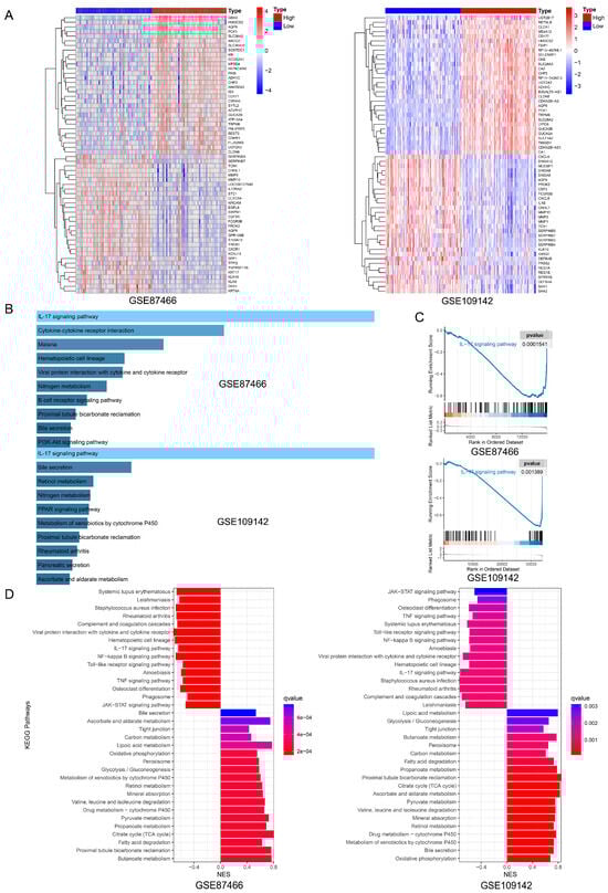 The enrichment scores for the IL-17 signaling pathway were determined using the gene set “IL-17 Family Signaling Pathways” from the “GeneCards” database (https://www.genecards.org/ (accessed on 20 November 2024)). Furthermore, the enrichment scores for 28 immune cell subtypes were evaluated using an annotated gene set downloaded from the “MSigDB” database (https://www.gsea-msigdb.org/gsea/msigdb/index.jsp (accessed on 20 November 2024)). The above enrichment analysis was performed using the R packages “GSEABase” (version 1.62.0) and “GSVA” (version 1.48.3).
