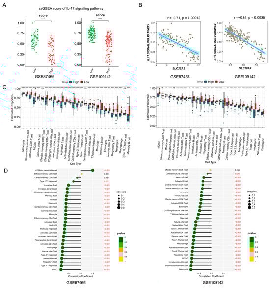 According to the expressing levels of SLC26A2, ssGSEA of the IL-17 signaling pathway and immune cell clusters were performed in the GSE87466 and GSE109142 datasets, respectively. (A) The scores of the IL-17 signaling pathway were significantly lower in the high SLC26A2 expression group, compared to the low expression group. (B) A strong negative correlation between the SLC26A2 expressing levels and scores of the IL-17 signaling pathway was observed by the Spearman correlation analyses. (C) The boxplots illustrated the differences in immune infiltration between the high and low expression groups of SLC26A2. (D) The correlations between immune cell infiltration and SLC26A2 were also estimated. (**** p < 0.0001).