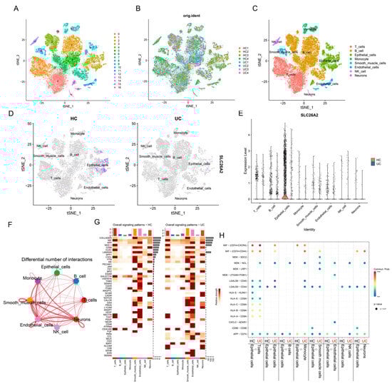 Localization analysis of SLC26A2 in single-cell sequencing data. (A–D) tSNE plots visualized the cell clusters, original identities, cell annotation, and localization of SLC26A2 in healthy controls and individuals with UC, respectively. (E) The distribution of SLC26A2 in cells with annotation was visualized as a violin plot. (F) Integrated map of the different numbers of interactions detected between each cell and other cells was presented. (G) Intensity demonstration of cell populations in different pathways in healthy controls and individuals with ulcerative colitis. (H) Differential signaling pathways in epithelial cells between healthy controls and individuals with UC revealed the diverse biological functions of epithelial cells.
