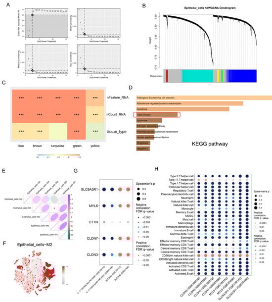 hdWGCNA revealed the potential biological functions of SLC26A2 at the level of single-cell RNA-seq. (A) The scale-free topology model displayed the scale-free fit index and the mean connectivity for various soft-thresholding powers. (B) The dendrogram illustrated illustrates the different modules in which genes are clustered. (C) The correlations between traits and modules were are shown in the correlation heatmap. (D) The KEGG pathways enriched by the genes in the brown module were listed, and the tight junction pathway (marked by a red box) was enriched. (E) The potential correlations among modules were calculated using the Pearson method. (F) Gene scores of the brown module were calculated using the UCell algorithm and presented in each cell. (G) The correlations between the genes involved in the tight junction in the brown module and SLC26A2 (as well as the IL-17 signaling pathway), were analyzed using the Spearman method. (H) Similar Spearman analyses were conducted between the genes involved in the tight junction in the brown module and immune cell subtypes. (*** p < 0.001).