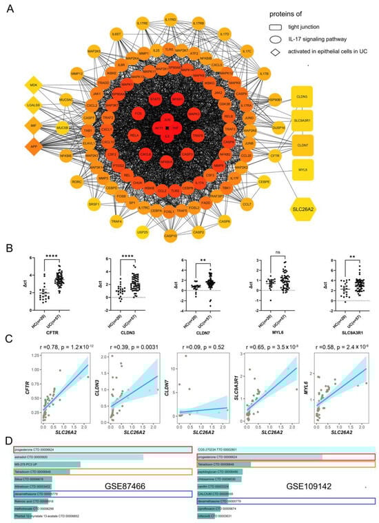 The relationship between SLC26A2 and tight junction genes. (A) The PPI network demonstrated the relationships among involved proteins, including SLC26A2, tight junction proteins, the IL-17 signaling pathway, and activated molecules in epithelial cells in UC. (B) The mRNA expressing levels of CFTR, CLDN3, CLDN7, MYL6, SLC26A3R1, and SLC26A2 were determined by the qRT-PCR. (C) The potential correlations between SLC26A2 and CFTR (CLDN3, CLDN7, MYL6, SLC26A3R1 and SLC26A2, respectively) were analyzed. (D) According to the expressing levels of SLC26A2 in GSE87466 and GSE109142 datasets, putative drugs were predicted, and the top 10 drugs were described. Progesterone CTD 00006624, tetradioxin CTD 00006848, and dexamethasone CTD 00005779 were highly co-enriched and indicated by the red, orange and blue boxes respectively. (** p < 0.01, **** p < 0.0001, and ns: no significance).