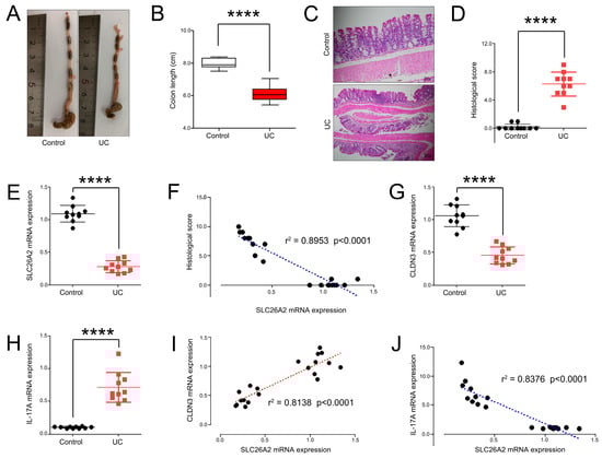 The relationships between SLC26A2 and CLDN3 (or IL-17A) at mRNA levels in vivo. (A) Photos of mice colon in each group. (B) The colon length of mice on 7th day in the control and UC groups. (C,D) The colons were stained by H&E, and the corresponding histological scores were compared. (E,F) The SLC26A2 mRNA expressions in each group were detected by qRT-PCR, and correlation analysis showed the potential relationships between SLC26A2 and histological scores. (G–J) The CLDN3 and IL-17A mRNA expressions in each group were also determined by qRT-PCR, and the relationships between SLC26A2 and CLDN3 (or IL-17A) were evaluated. (**** p < 0.0001).