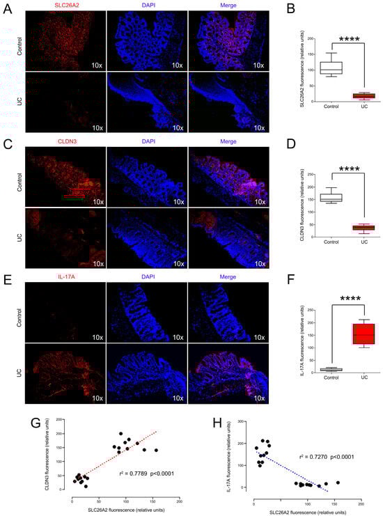 The relationships between SLC26A2 and CLDN3 (or IL-17A) at protein levels in vivo. (A–F) The protein expressions of SLC26A2, CLDN3 and IL-17A in mice colon were determined by immunofluorescence, and the fluorescence quantification was compared. (G,H) Spearman–Pearson correlation between SLC26A2 and CLDN3 (or IL-17A) fluorescence intensity in mice was analyzed. (**** p < 0.0001).
