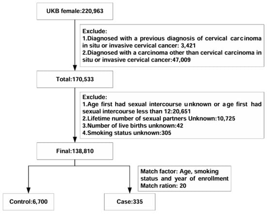 We conducted a prospective matched nested case–control study using data from female participants of European ancestry in the UK Biobank cohort []. The UK Biobank is a large prospective cohort study that encompasses over 500,000 individuals aged from 40 to 69, residing within communities across the United Kingdom from 2006 to 2010. These participants congregated at 22 assessment centers distributed throughout England, Scotland, and Wales. At these centers, they diligently fulfilled surveys and underwent comprehensive physical measurements, collectively contributing to the wealth of data amassed by the study. We obtained data on 21 July 2022 and set that date as the end-of-follow-up date.