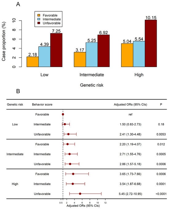 Joint effects of the sexual and reproductive behavior score and PRS on the risk of cervical carcinoma. (A) The case proportion in subgroups. (B) The adjusted ORs of subgroups. Models were adjusted for BMI and oral contraceptives.