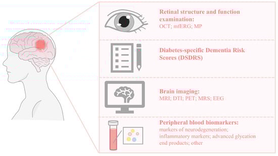 Cognitive impairment secondary to diabetes can have a negative impact on patients’ daily lives, leading to increased needs for personal care, higher hospitalization rates, and a greater likelihood of developing depression []. This not only hinders patients’ ability to care for themselves but also results in higher healthcare costs, creating an economic burden on both families and society. Additionally, blood sugar control in patients with diabetes and CI is often problematic. Both hyperglycemia and hypoglycemia can adversely affect cognitive function. Studies have shown that higher average blood glucose levels in diabetic patients are associated with an increased risk of dementia (p = 0.002). At a glucose level of 10.5 mmol/L versus 8.9 mmol/L, the adjusted hazard ratio for dementia was found to be 1.40 (95% CI, 1.12 to 1.76) []. During acute hypoglycemia, diabetic patients showed significant declines in performance on short-term memory, delayed memory, and working memory tests, with working memory and delayed memory being most severely affected []. Poor blood glucose control appears to be a risk factor for cognitive decline, which, in turn, exacerbates the severity of CI in diabetic patients, creating a vicious cycle that undoubtedly complicates their treatment and care. Furthermore, multiple studies on individuals with impaired glucose tolerance but without diabetes have shown that, compared to the control group, they scored lower on the Mini-Mental State Examination (MMSE), had poorer long-term memory, reduced verbal fluency, and exhibited a higher incidence of Alzheimer’s disease (AD) and vascular dementia []. This suggests that some diabetic patients may experience cognitive decline even in the early or preclinical stages of diabetes. Therefore, the early diagnosis and treatment of T2DM patients with CI are beneficial to delay cognitive decline and improve prognosis. Although there are currently many methods for detecting CI, there remains controversy regarding their effectiveness, particularly in the early diagnosis of diabetes-related cognitive impairment. The American Diabetes Association (ADA) guidelines from 2020 recommend simple cognitive screening tools, such as the MMSE, the Montreal Cognitive Assessment (MoCA), and Mini-Cog, for assessing cognitive function in diabetic patients []. However, these screening methods seem to be influenced by other factors and have relatively low sensitivity. Therefore, this review aims to summarize and evaluate potential screening and diagnostic methods, as well as biomarkers for CI in diabetes. The goal is to provide information for clinical decision making and future research, with the aim of identifying valuable, clinically applicable diagnostic tools for early detection and intervention, ultimately improving patient outcomes.