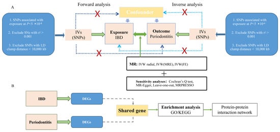 This study incorporated parallel MR and bioinformatics analyses. The MR analysis was conducted in accordance with the Strengthening the Reporting of Mendelian Randomization Studies (STROBE-MR) guidelines [38]. For genome-wide association study (GWAS) data acquisition, we downloaded IBD data [39] (GWAS number: ieu-a-31, Ncase/Ncontrol: 12,882/21,770) and its major subtypes, CD (GWAS number: ieu-a-30, Ncase/Ncontrol: 5956/14,927) and UC (GWAS number: ieu-a-32, Ncase/Ncontrol: 6968/20,464), from the OpenGWAS database (https://gwas.mrcieu.ac.uk/, accessed on 15 October 2024). Chronic periodontitis data (GWAS number: finn-b-K11_PERIODON_CHRON, Ncase/Ncontrol: 3046/195,395) were obtained from the Finngen database (https://www.finngen.fi/, accessed on 15 October 2024) [40]. All datasets comprised large-scale cohorts from distinct geographical regions within the same ethnic population, minimizing potential sample overlap bias.