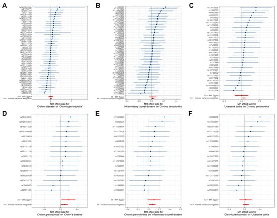 Forest plot for the causal effects estimates of each SNP on outcomes. (A–F) represent each SNP results for different analytical directions, respectively (with the title description at the bottom of each figure). The blue horizontal line represents the distribution range of the estimated effect value for current SNP, and the blue dots represent the size of the estimated effect value. The vertical line at coordinate 0 is the reference line. The red dots signify the overall causal effect based on MR Egger and inverse variance weighted methods, with the red lines passing through these dots delineating the range of variation in the causal effect.
