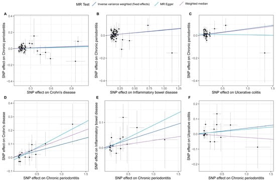 Scatter plots for effects of genetic liability to exposure on outcomes in this bidirectional MR analysis. A to F represent different analytical directions, respectively. Specifically, A-C denote the analyses from Crohn’s disease (A), inflammatory bowel disease (B), and ulcerative colitis (C) to periodontitis; while D-F represent the analyses from periodontitis to Crohn’s disease (D), inflammatory bowel disease (E), and ulcerative colitis (F). Each point represents an included SNP, and the color of the lines corresponds to the methods described in the legend.