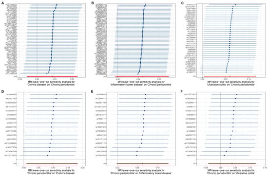 Leave-one-out tests were conducted to evaluate the effects of excluding individual SNPs on the results of MR analysis. (A–F) represent the leave-one-out analysis results for different analytical directions, respectively (with the title description at the bottom of each figure). The horizontal blue line represents the distribution range of the estimated effect value after removing current single nucleotide polymorphism, and the blue dots represent the size of the estimated effect value. The vertical line at coordinate 0 is the reference line. The red dots signify the overall causal effect, with the red lines passing through these dots delineating the range of variation in the causal effect.