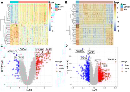 We extracted RNA sequencing data for IBD and periodontitis patients from the GEO database, with each dataset including samples from healthy controls. Differential analysis between the disease cohorts and the healthy controls revealed significant gene expression alterations in patients with periodontitis (Figure 6A,C) and IBD (see Figure 6B,D), predominantly involving genes associated with the immune and inflammatory responses, such as immunoglobulin lambda joining 3 (IGLJ3), C-X-C motif chemokine receptor 4 (CXCR4), CD74 molecule (CD74), complement C2 (C2), among others. These alterations suggest that changes in the expression levels of genes related to immune and inflammatory responses may play a pivotal role in the pathogenesis of periodontitis and IBD, affecting immune cell activity, cytokine release, and immune regulation. This could be a key factor exacerbating the progression of these diseases, implying the potential of these genes as targets for future therapeutic interventions.