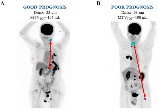 - Albano, D.; Treglia, G.; Dondi, F.; Calabrò, A.; Rizzo, A.; Annunziata, S.; Guerra, L.; Morbelli, S.; Tucci, A.; Bertagna, F. 18F-FDG PET/CT Maximum Tumor Dissemination (Dmax) in Lymphoma: A New Prognostic Factor? Cancers 2023, 15, 2494. [Google Scholar] [CrossRef] [PubMed]