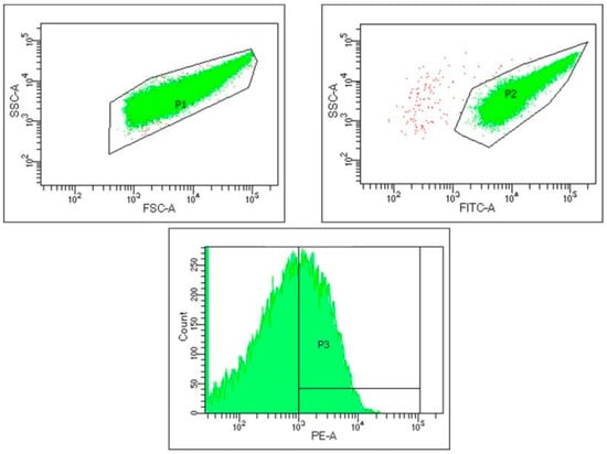 Illustration of the protocol used for platelet activation analysis. FSC–forward scatter; SSC—side scatter; FITC—fluorescein isothiocyanate; PE—phycoerythrin. In P1, platelets are gated by size and granularity, while in P2, platelets are gated using anti-CD41a-FITC antibody. P3 presents platelets activated using anti-CD62-PE antibody.