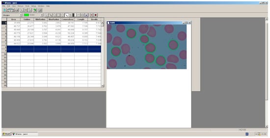 Blood smears were prepared from the human blood samples (both experimental and control groups) and stained using Pappenheim’s method (May–Grünwald and Giemsa solutions). The stained blood smears were then subjected to computer analysis (basic morphometric characteristics of erythrocytes) using the SFORM program (Version 1.0; VAMSTEC, Zagreb, Croatia) (Figure 3). The system includes a high-resolution colour camera (Donpisha 3CCD), which digitises the image under a 100× magnification lens of the Olympus BX 41 light microscope and transfers it to a personal computer. The primary (size) morphometric indicators and erythrocyte shape indicators were then determined. A total of 180 stained blood smears of human erythrocytes were analysed, with more than 100 erythrocytes measured for each smear. A total of 26,068 erythrocytes were measured from the control and experimental smears. The erythrocytes were measured in 90 control smears and 90 experimental smears. Only erythrocytes that were not overlapping with others were analysed. The boundaries of the erythrocyte cytoplasm were marked interactively (initially using an automatic erythrocyte rounding command) and then manually corrected with a computer mouse. The following parameters were determined for the erythrocyte cytoplasm: area (μm2), outline (μm), convex area or convexity (μm2), minimum and maximum radius (μm), length (μm), and width (μm). The shape indicators for erythrocytes were calculated based on primary indicators (length, width, area, and outline) using the following formulae: