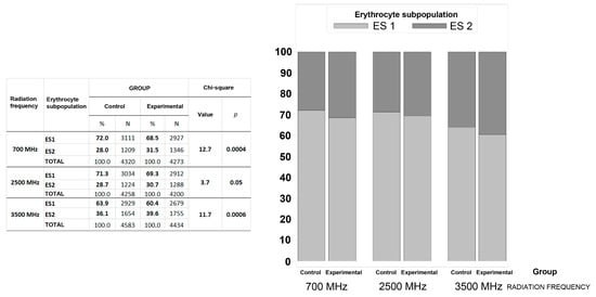 Proportion of erythrocyte subpopulations (ESs) of humans in the control and experimental groups depending on the frequency of 5G radiofrequency electromagnetic radiation (700 MHz, 2500 MHz, or 3500 MHz). ES 1—erythrocyte subpopulation with smaller and rounder erythrocytes and with more regular/smoother membranes; ES 2—erythrocyte subpopulation with larger erythrocytes and with more irregular membranes.