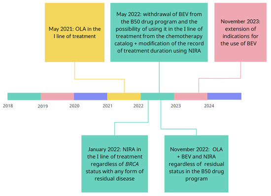 The criteria for inclusion in modern therapies in OC and the availability of them have changed dramatically in recent years, and along with changes in the world, we have witnessed their reflection in Polish conditions [24]. The subsequent points marked on the timeline in Figure 1 indicate the dynamic changes that have occurred in Polish health care in recent years. At that time Polish program was changed according to the PRIME trial results to use niraparib regardless of residual disease.