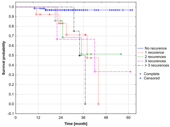 The results indicate that the number of recurrences is a strong and statistically significant prognostic factor for survival (p < 0.001). Each additional recurrence increases the risk of death by 80%. The confidence interval (1.33–2.43) indicates the high precision of the estimate.