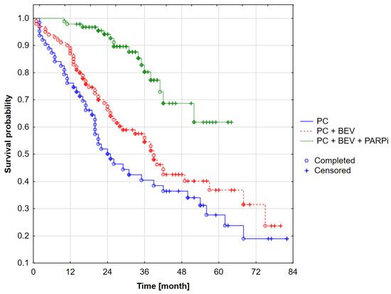 The above work analyzes and divides patients into groups regarding the chemotherapy drugs they take. It is worth noting that during the study period, both new therapeutic programs appeared, and the inclusion criteria have changed. The availability of PARP inhibitors changed in subsequent years, and the scope of use of bevacizumab has extended. As far as the scope of molecular analysis is concerned, all patients diagnosed at the level of genome sequencing from cancer tissue are cared for in a genetic clinic. The NGS method assessed the BRCA1 and BRCA2 genes with flanking sequences without assessing large rearrangements. Secondarily, patients at the clinic are also tested for other founder mutations—including mutations in the PALB or CHECK genes. Additionally, if the patient’s interview shows that ovarian cancer may be part of a genetic syndrome, e.g., Lynch syndrome, additional molecular diagnostics are also implemented.