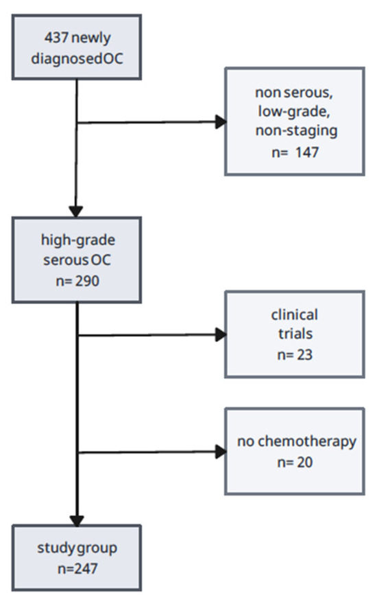 Study design considering inclusion and exclusion criteria. OC—ovarian cancer, primary peritoneal and fallopian tube cancer; n—number.