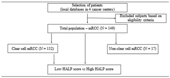 Study design flowchart. The local databases of four cancer centers in Slovakia were used for selection of patients with mRCC. The total study population consisted of patients with mRCC, regardless of histology, who met the inclusion and exclusion criteria. The total population and subpopulation with solely clear-cell mRCC were divided into subgroups based on the median HALP score (27.53). Abbreviations: mRCC, metastatic renal cell carcinoma; N, number of patients; HALP, a score combining hemoglobin and albumin levels with lymphocyte and platelet counts.