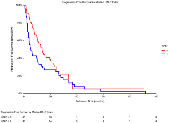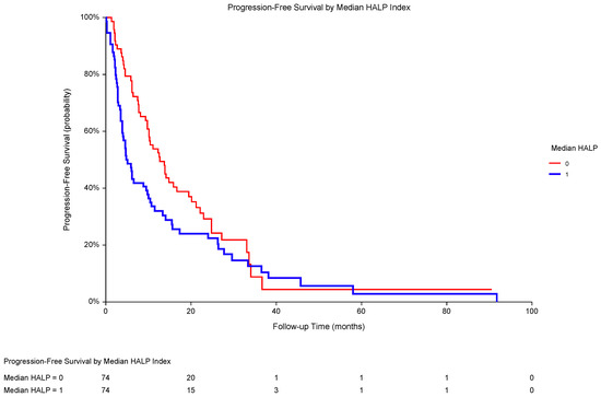 In metastatic RCC patients (the total population), PFS was significantly worse with a low HALP score (1; median PFS 4.8 months) compared to that with a high HALP score (0; median PFS 12.7 months) (p = 0.0382; HR 0.69, 95% CI 0.48–0.99). The median HALP score was 27.53, and HALP ≤ 27.53 was considered low. Abbreviations: RCC, renal cell carcinoma; PFS, progression-free survival; HALP, a score combining pretreatment hemoglobin, albumin, lymphocytes, and platelets; HR, hazard ratio; CI, confidence interval.
