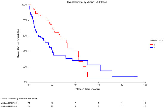 The HALP score combines hemoglobin and albumin levels with lymphocyte and platelet counts. It was introduced by Chen et al. as a novel immune–nutritional prognostic biomarker in patients with gastric carcinoma following surgery in 2015 [17], and subsequently studied in several malignancies with conflicting results [18]. Nevertheless, a meta-analysis has revealed that a low HALP score is associated with worse OS, cancer-specific survival (CSS), and PFS/disease-free survival (DFS)/relapse-free survival (RFS) across various tumor types and stages [19]. Some studies have also shown an association between the index and response to immunotherapy, as well as chemotherapy [18].