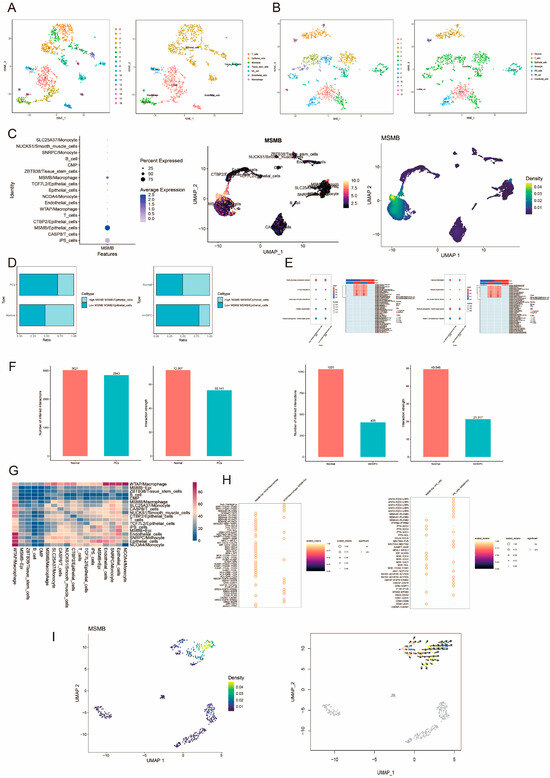 Single-cell analysis of MSMB in prostate cancer. (A) The tSNE plot of cell clusters and cell types in normal tissue versus PCa. (B) The tSNE plot of cell clusters and cell types of normal tissue with mHSPC. The different colored dots in figure (A,B) represent different cell clusters or cell types. (C) Expression levels of MSMB in different cells. The size of the circles in the diagram on the left indicates the proportion of gene expression. The larger the circle, the greater the proportion of gene expression. The color gradient indicates the strength of the gene expression level. Darker colors in the three graphs indicate higher MSMB expression. (D) Comparison of the differences between the high- and low-ratio groups of MSMB/Epithelial_cells in normal tissue versus PCa and normal tissue versus mHSPC. Light blue indicates MSMB/epithelial_cells high percentage group, and dark blue indicates MSMB/epithelial_cells low percentage group. (E) KEGG and GSEA analyses of normal tissues versus PCa and normal tissues versus mHSPC. The size of the circle in KEGG analysis represents the gene ratio. The color gradient indicates the size of the adjusted p-value, with darker colors representing smaller p-values. Blue in Cluster in GSEA analysis indicates a high-proportion group of MSMB/Epithelial_cells, and red indicates a low-proportion group of MSMB/Epithelial_cells. Blue in Direction indicates a downregulation, and red indicates an upregulation. In RRA, red color indicates statistical significance and vice versa. *: p < 0.05, **: p < 0.01, ***: p < 0.001, ****: p < 0.0001. (F) Comparison of the number and intensity of cellular communication between normal tissue and PCa, and normal tissue and mHSPC. (G) Comparison of the intensity of cellular communication activities between different cell subpopulations. The color gradient from blue to red indicates a gradual increase in the strength of the intercellular interaction. (H) Analysis of ligand-receptor interactions of MSMB_Epithelial_cells with WTAP/Macrophage and iPS_cells, respectively. Circle size and color gradient indicate the magnitude of ligand-receptor interactions. Larger circles and lighter colors indicate larger ligand-receptor interactions. A red line outside the circle indicates statistical significance and vice versa. (I) The pseudotime analysis of MSMB/Epithelial_cells. The color gradient indicates the level of gene expression density. Lighter colors indicate higher expression density.