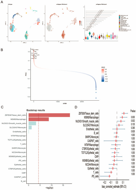 scPagwas screening for genes and cell populations associated with PCa. (A) TRS and differential analysis of different cell types. The color gradient in the second graph indicates the level of TRS scores; the darker the color, the higher the TRS score. The color gradient in the third graph indicates different cell types. (B) scPagwas identifies the top 10 genes significantly associated with PCa. Red color indicates positive correlation and blue color indicates negative correlation. (C) Cell types significantly associated with PCa inferred by self-help method. (D) Bias corrected estimate for each cell type inferred by self-help method.