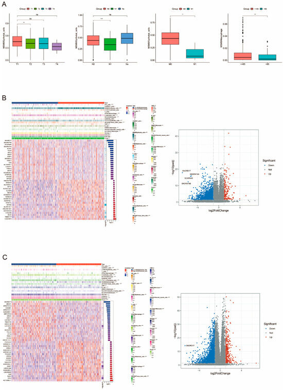 Multiple grouping analysis of convolutional cells. (A) Clinical subgroup analysis of MSMB/Epithelial_cells and MSMB/Macrophage. (B) Correlation analysis of MSMB/Macrophage with the rest of convoluted cells and tumor microenvironment analysis. The right panel shows the volcano plot of difference analysis between MSMB/Macrophage high and low percentage groups. (C) Correlation analysis of MSMB/Epithelial_cells with the rest of convoluted cells and tumor microenvironment analysis. The right panel demonstrates the volcano plot of difference analysis between MSMB/Epithelial_cells high and low percentage groups. The red color in Type in the heatmap indicates the high-expression group of cell types, and the blue color indicates the low-expression group. Different cell types and tumor microenvironment types are included in the notes on the right. The color gradient indicates the degree of cell type or tumor microenvironment type predominance. The darker the color, the higher its predominance. The blue color in the volcano plot indicates downregulation, and the red color indicates upregulation. * p < 0.05; ** p < 0.01; *** p < 0.001.